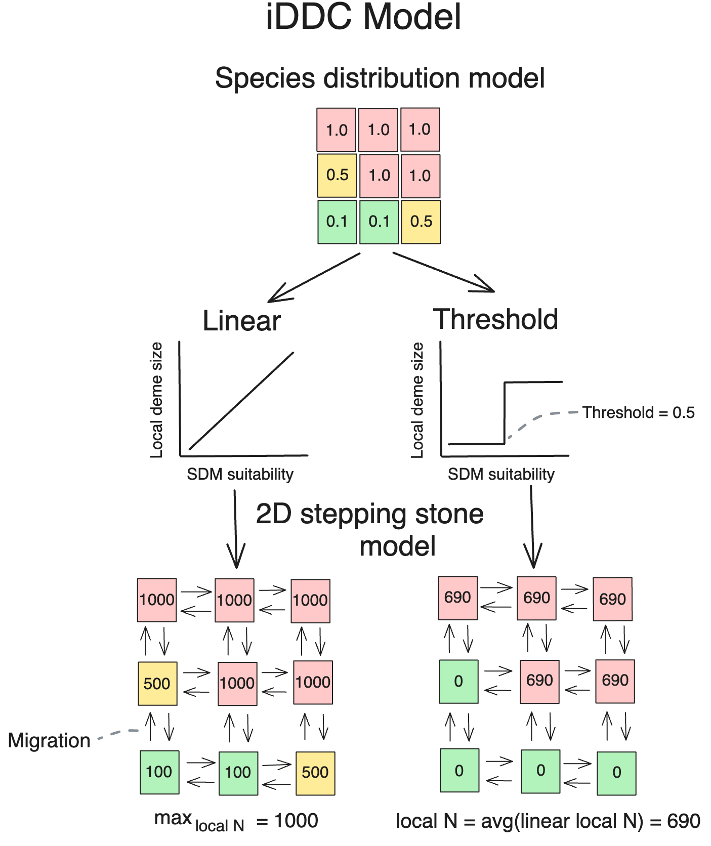 iDDC models establish a link from SDM suitability to abundance to genetic diversity